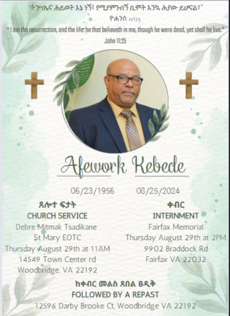 Mr. Afework Kebede was born on June 23, 1956 in Addis Ababa, Ethiopia. After his education, he served as an engineer in Arba Minch and later moved to America where he worked in IT to support his family. Mr. Afework passed away due to a sudden illness on August 25, 2024, at Sentara Hospital at the age of 68. May our lord and savior grant his soul eternal peace.