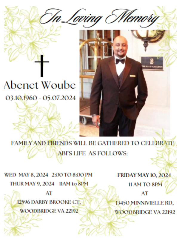 Mr. Abenet Woube was born in Addis Ababa, Ethiopia on March 1st, 1952. After completing his education in Ethiopia, he traveled to Belgium, and later America where he married his wife, Lemlem Abebe and raised his two children, Leykun and Emnet Abenet. Mr. Abenet passed away on May 7, 2024, after a 15-month illness at his home in Woodbridge, VA.